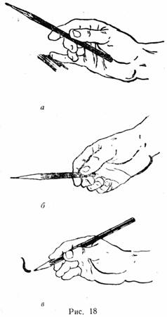 Некоторые начинающие художники держат карандаш так же, как и при письме. Это неправильно. Карандаш надо держать так, как показано на рис. 18 а, прикасаясь к поверхности бумаги только грифелем и изредка мизинцем. При этом движения кисти руки свободны, она и заправляет штрих по форме разнообразно, как бы выстилая ее штрихами (см. приложение, илл. 1). Да и рисунок рука не затирает, не размазывает и не мешает видеть весь целиком. Протянутая рука, держащая карандаш довольно далеко от острия грифеля, удерживает художника на расстоянии, необходимом для целостного восприятия рисунка. Начинающим художникам с непривычки трудно рисовать именно так: неумелой руке неловко держать карандаш поновому, она быстро устает в вытянутом положении.