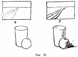 Усиливать тона можно жирными штрихами, по при этом надо учитывать общую тональность рисунка, не допуская излишней черноты, оберегая красивый серебристый тон, характерный для карандашного рисунка. Не следует допускать также глухой, сплошной затушевки теней. Во избежание этого новые штрихи наносят наискось или поперек других штрихов, положенных раньше, и следят, чтобы между штрихами оставались хотя бы точечные просветы, придающие даже самому темному тону известную воздушность. Оберегайте зерно бумаги от заглаживания, так как лоснящаяся бумага в рисунке и затертости штрихов придают рисунку крайне непривлекательный вид, блестят, мешая рассматривать изображение. Некоторые начинающие любители рисования связывают с гладкой и «аккуратной» оттушеванностыо свое представление о законченности рисунка. Они глубоко ошибаются: это не законченность рисунка, а «приконченность» его, и внешняя аккуратность по существу мертвит изображение. Тушевка напоминает только ремесленную ретушь фотографий. Свою приверженность к ней иные любители пытаются оправдать ссылками на работы старых мастеров, у которых будто бы законченные рисунки доводились до предела тщательности в тушевке. Это глубокое заблуждение, так как у подлинных мастеров ни тушевка, ни линия и другие средства рисунка никогда не были самоцелью. У начинающего рисовальщика всегда появляется соблазн оттушевать блики и рефлексы металлического' предмета, прочертить его жесткие линии. Посмотрите рисунок великого итальянского художника XVI века Тициана (см. приложение, илл. 1). Вглядитесь пристально в каждый штрих. Обратите внимание, какое живое впечатление производит рисунок в целом. В рисунке мастера вы чувствуете материальность видавшего виды" шлема, покрытого вмятинами. Но ни одна деталь не отчеканена в ущерб целостности рисунка. Все средства рисунка художник направил на выявление главного — формы. Он смело набрасывал штрихи так, словно обнимал ими весь шлем, поэтому штрихи заворачивал, заводил за видимую часть формы. Самые сильные нажимы художник делал всякий раз, когда старался подчеркнуть выпуклость, выступающую ближнюю часть забрала. Удаленные края его он штриховал гораздо мягче, почти физически заводя штрихи за шлем. И вот опять на зрителя идет все более четкий и сочный штрих, а на самом выпуклом месте шлема край забрала резко очерчен сильным взмахом угля, четкой и самой темной тенью. Посмотрите, как убедительно передано закругление «краев» формы: штрихи то почти исчезают или смазываются, то появляется местами «краевая» линия. Но нигде нет контура ради контура, нигде эта линия не спорит по своей силе и чет кости с напряженными ударами углем на самых выпуклых местах формы. Разнообразием штриховки в сочетании с мазком художник не только достиг впечатления полной объемности формы, но и передал характер предмета, свое обостренно живое ощущение образа натуры. Неисчерпаемые возможности штриха, линии, пятна в рисунке демонстрируют и другие работы мастеров разных эпох. Несложные схемы (рис. 19, 20) тоже показывают на простейших примерах «силу» линии и штриха.