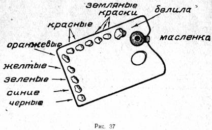 Краски выдавливают из тюбиков и смешивают на палитре, деревянной или фанерной, пропитанной маслом и имеющей отверстия для пальца и кистей (рис. 37). Для начинающих можно рекомендовать белые палитры, изготовленные из прямоугольного стекла, окрашенного снизу белилами или оклеенного белой бумагой. На такой палитре легче находить нужные оттенки. Прежде всего позаботьтесь о порядке наложения красок на палитру. Беспорядочное нанесение красок па палитру крайне затрудняет поиски необходимых оттенков и часто является причиной грязного цвета смесей. Лучше всего уже на палитре разделить краски на теплые и холодные оттенки. Тогда легче будет «угадать», какие краски входят в состав искомого цвета, и удобнее будет смешивать их на палитре.